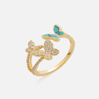 • التفاصيل: خاتم بتصميم يتزين بحلي بشكل فراشات مرصعه بفصوص الزركون البراق وفراشة بلون أزرق