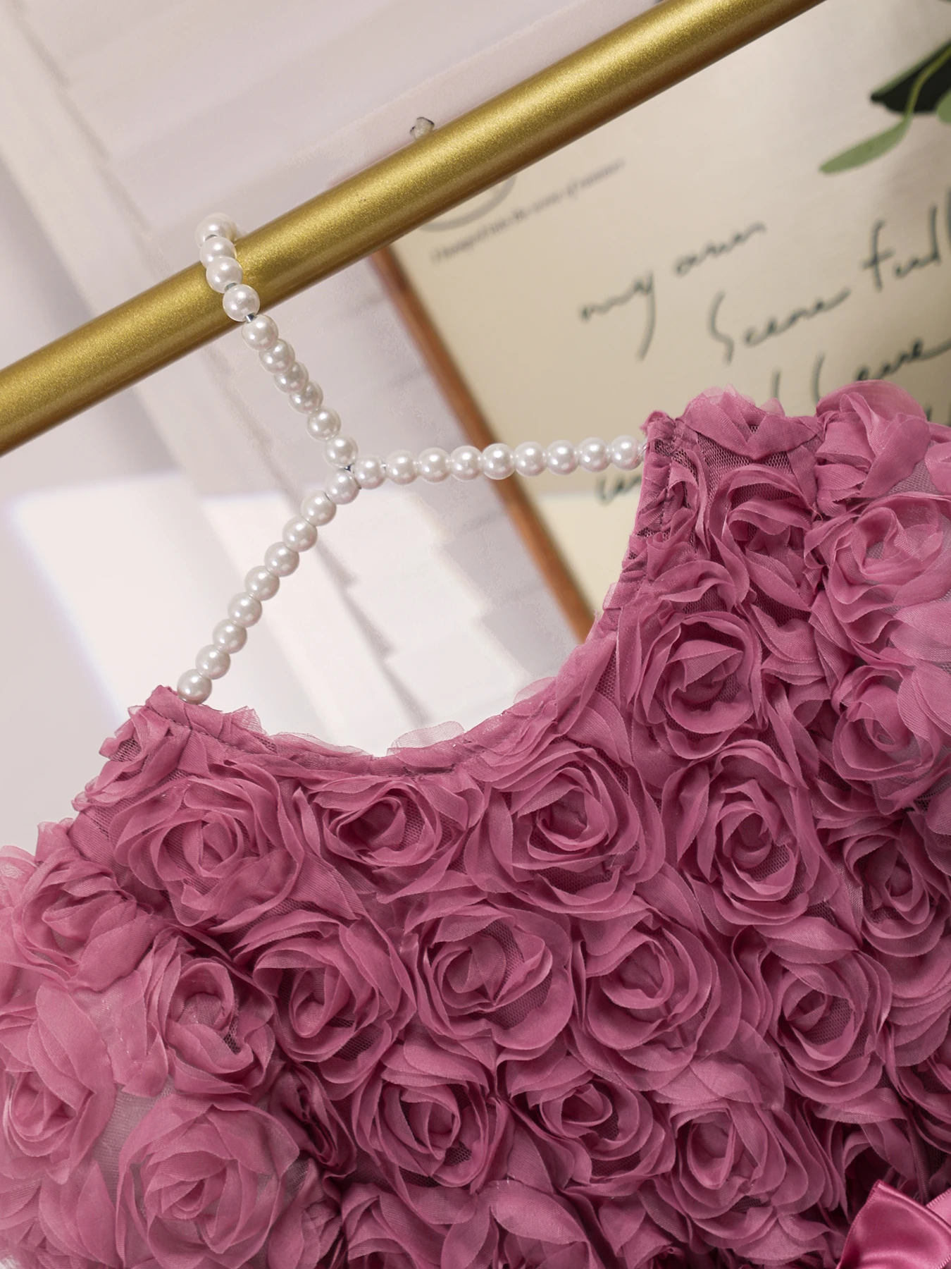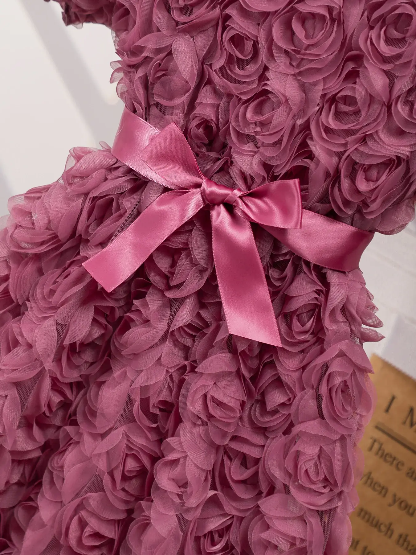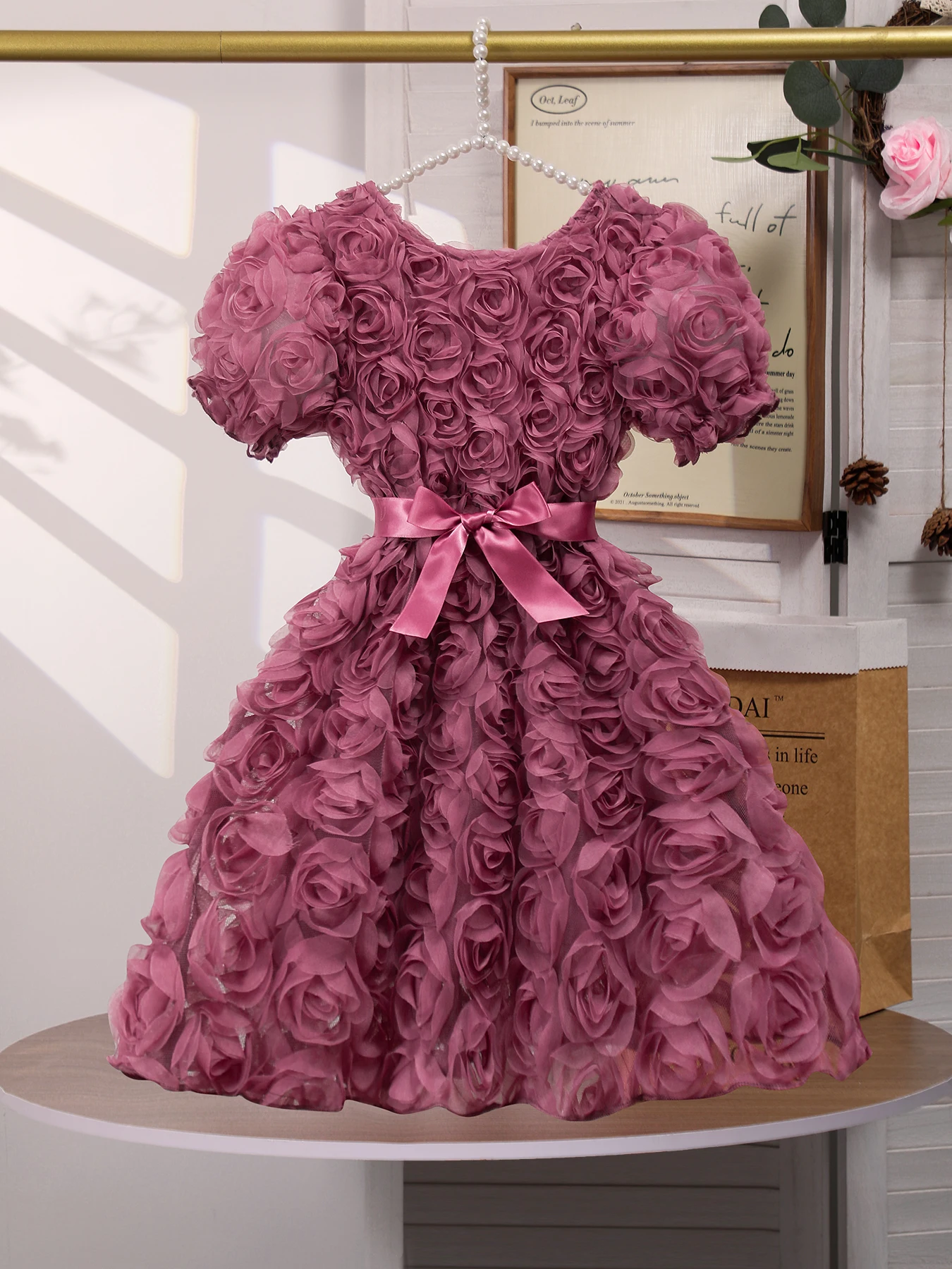 يتميز فستان هذه الفتاة بنمط وردة جميل ثلاثي الأبعاد، مما يضيف لمسة أنيقة إلى خزانة ملابسها الصيفية.